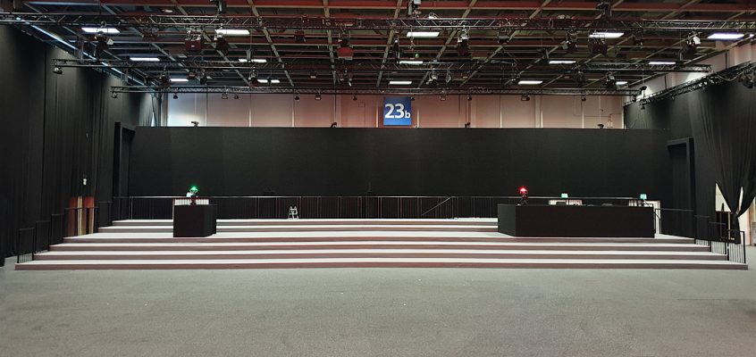 Auftrageber: Aventem GmbH Termin: August – September 2022 Location: Messe Berlin Halle 23b zu unseren Aufgaben zählte u.a. Tribünenbau und Verkleidung Bodenbeläge auf Bühne und Tribüne FOH Und Kameraverblendung Personalsupport
