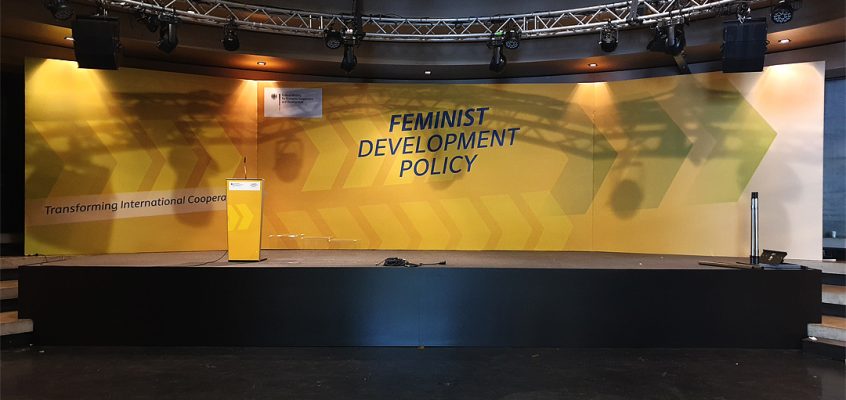 Auftrageber: mediapool Veranstaltungsgesellschaft mbH Termin: September 2022 Location: Tempodrom Berlin Veranstaltung: Feminist Development Policy zu unseren Aufgaben zählte u.a. Bühnenrückwand